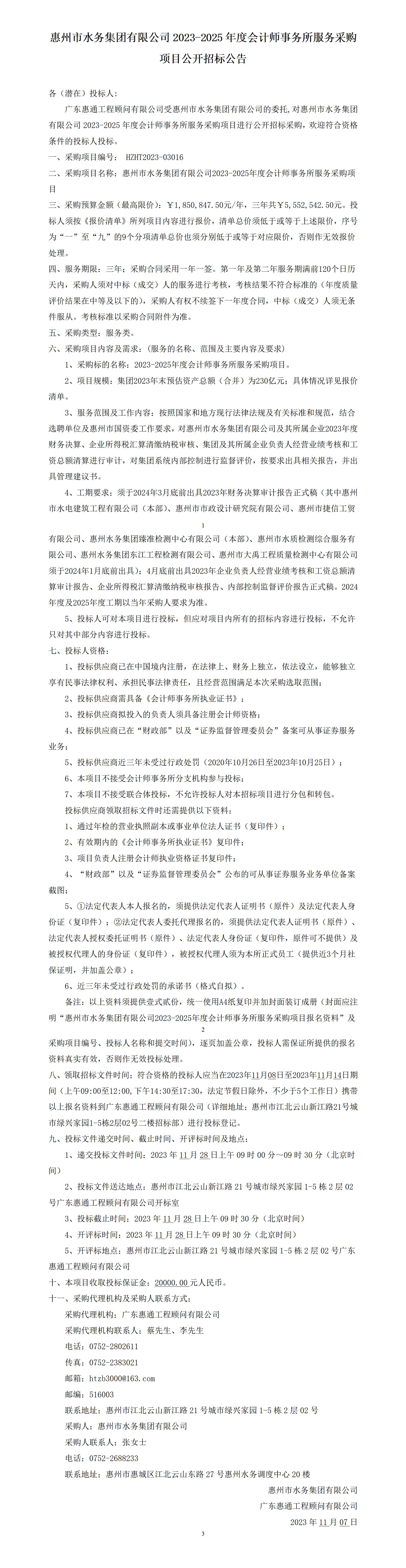 惠州市水務(wù)集團(tuán)有限公司2023-2025年度會計師事務(wù)所服務(wù)采購項目公開招標(biāo)公告